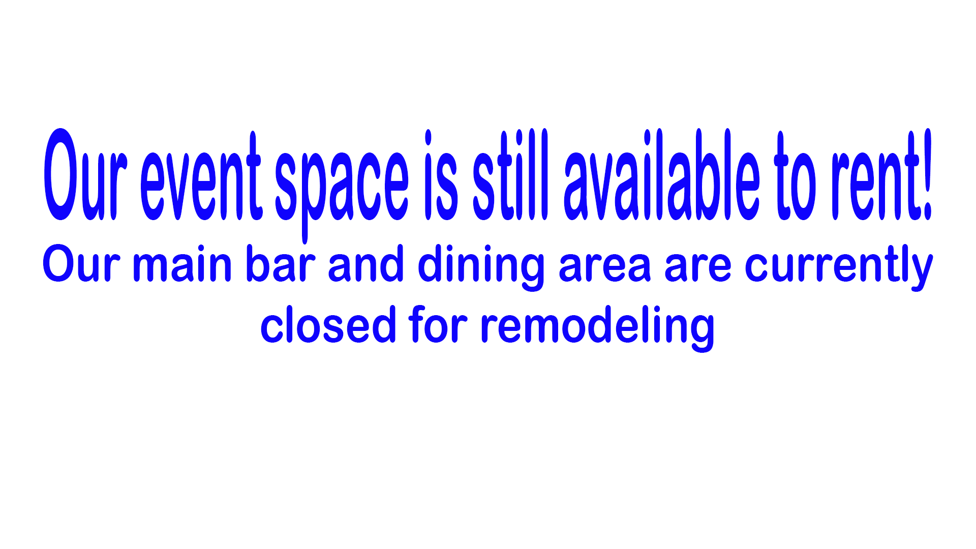 Our event area is still available to rent, our main bar and kitchen are temporarily closed for remodeling.